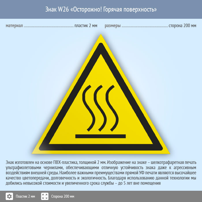 Знак W26 «Осторожно! горячая поверхность» (пластик, сторона 200 мм) в Улан-Удэ купить
