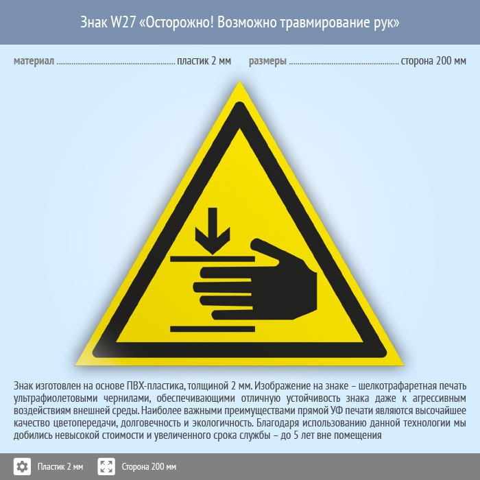Знак W27 «Осторожно! возможно травмирование рук» (пластик, сторона 200 мм) в Улан-Удэ купить