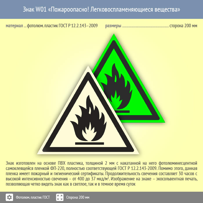 Знак W01 «Пожароопасно! Легковоспламеняющиеся вещества» (фотолюминесцентный пластик ГОСТ 34428-2018, сторона 200 мм) в Улан-Удэ купить
