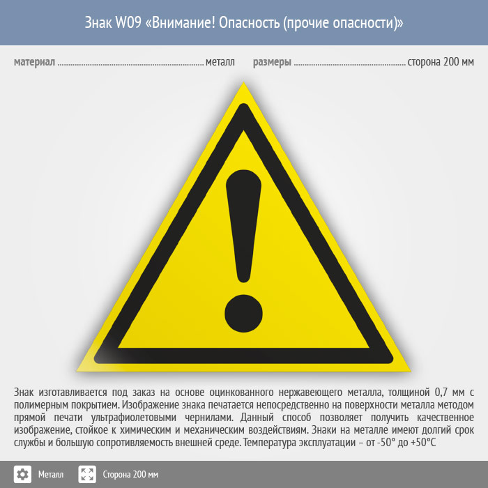 Знак W09 «Внимание! опасность (прочие опасности)» (металл, сторона 200 мм) в Улан-Удэ купить