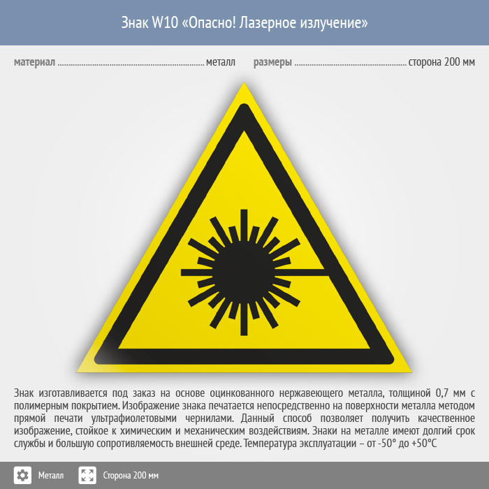 Знак W10 «Опасно! лазерное излучение» (металл, сторона 200 мм) в Улан-Удэ купить