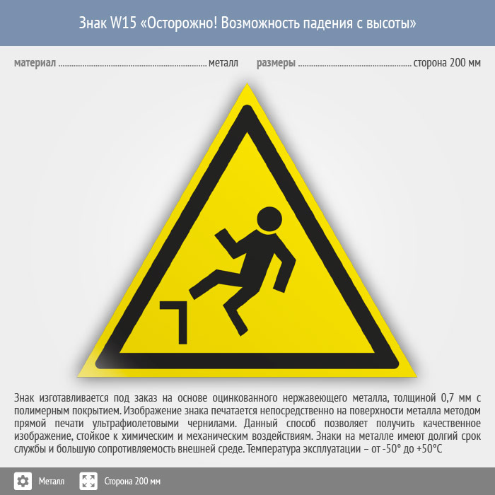 Знак W15 «Осторожно! возможность падения с высоты» (металл, сторона 200 мм) в Улан-Удэ купить