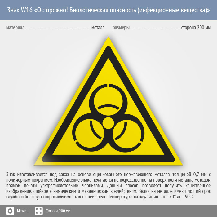 Знак W16 «Осторожно! биологическая опасность (инфекционные вещества)» (металл, сторона 200 мм) в Улан-Удэ купить