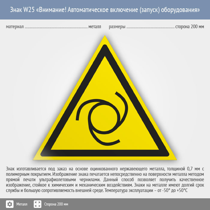 Знак W25 «Внимание! автоматическое включение (запуск) оборудования» (металл, сторона 200 мм) в Улан-Удэ купить