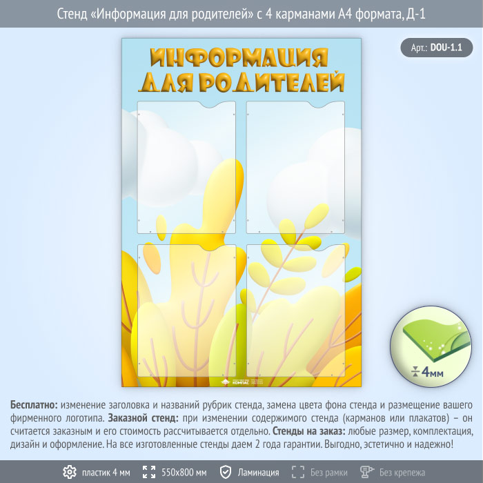 Стенд «Информация для родителей» с 4 карманами А4 формата (DOU-1.1) в Улан-Удэ купить