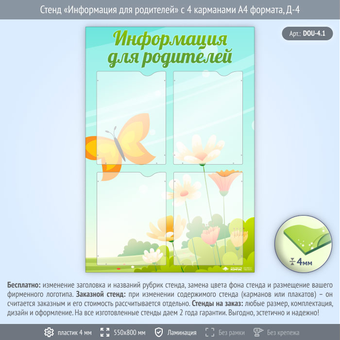 Стенд «Информация для родителей» с 4 карманами А4 формата (DOU-4.1) в Улан-Удэ купить