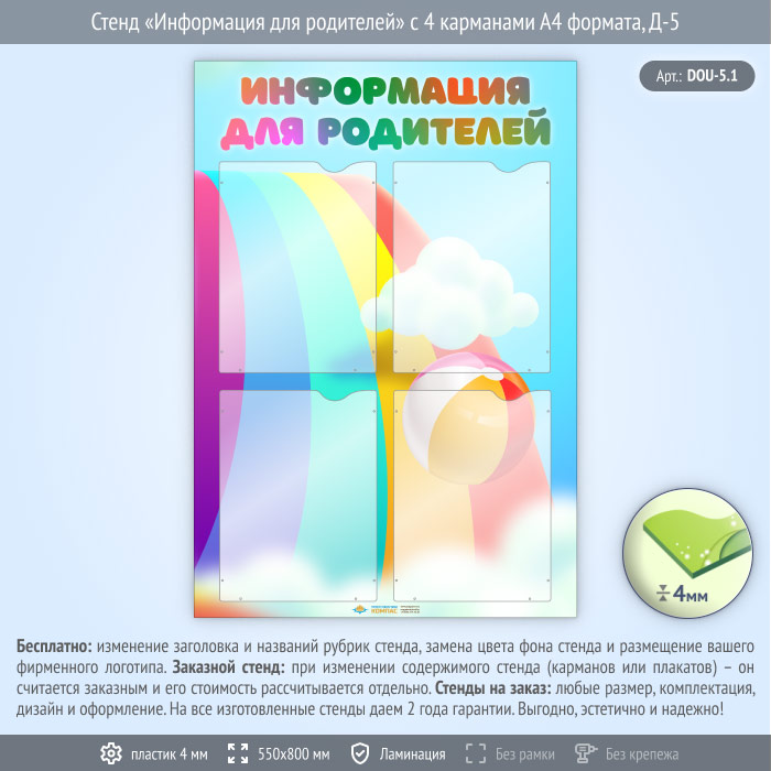 Стенд «Информация для родителей» с 4 карманами А4 формата (DOU-5.1) в Улан-Удэ купить
