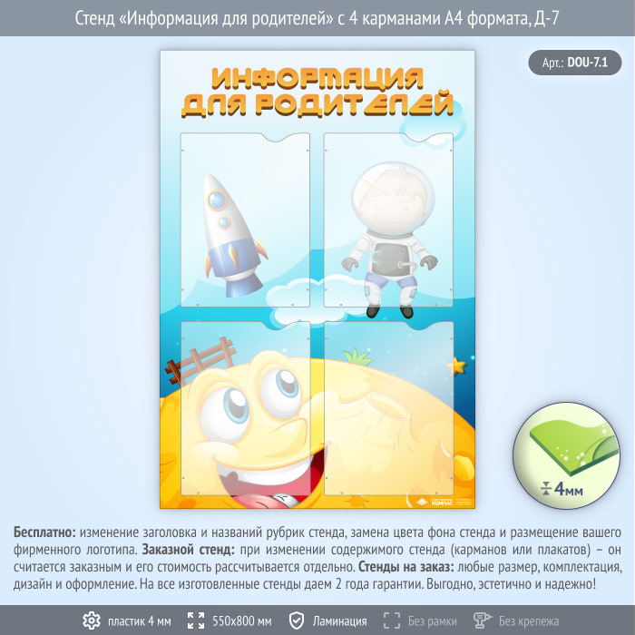 Стенд «Информация для родителей» с 4 карманами А4 формата (DOU-7.1) в Улан-Удэ купить