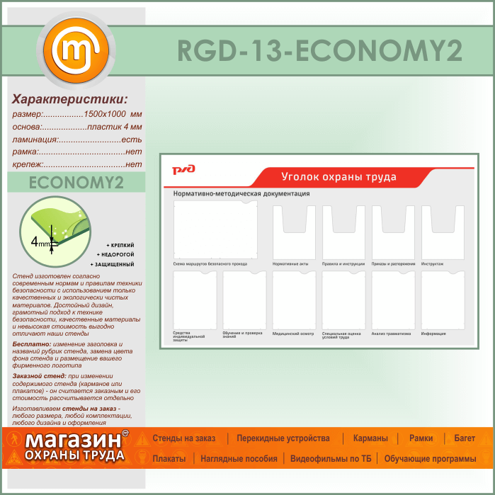 Стенд «Уголок охраны труда» с 1 плоским карманом А3 формата, 6 плоскими и 4 объемными карманами А4 формата (RGD-13-ECONOMY2) в Улан-Удэ купить