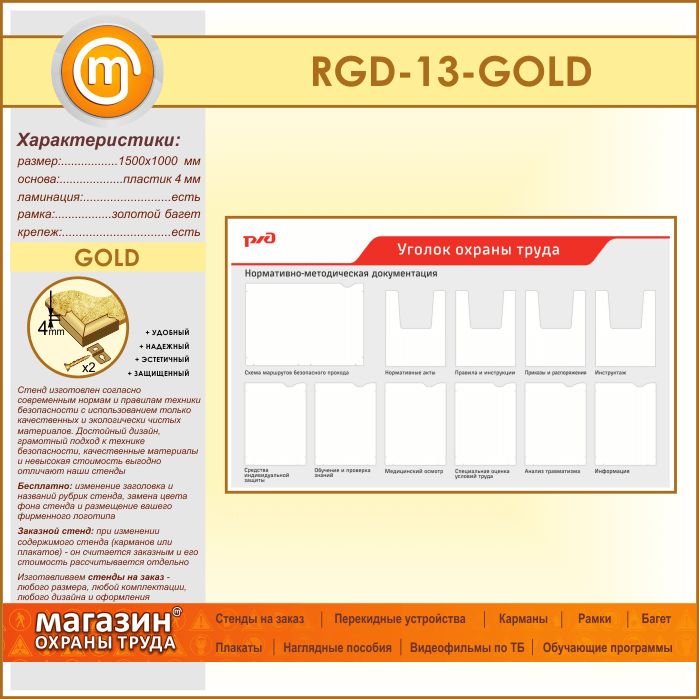 Стенд «Уголок охраны труда» с 1 плоским карманом А3 формата, 6 плоскими и 4 объемными карманами А4 формата (RGD-13-GOLD) в Улан-Удэ купить