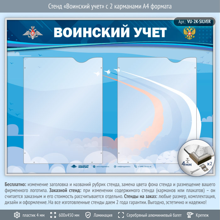 Стенд «Воинский учет» с 2 карманами А4 формата (VU-2K-SILVER) в Улан-Удэ купить