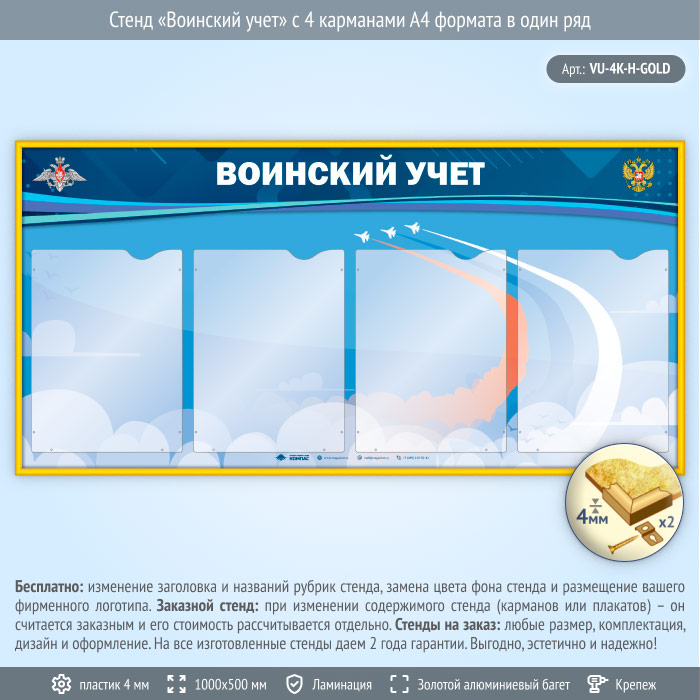 Стенд «Воинский учет» с 4 карманами А4 формата в один ряд (VU-4K-H-GOLD) в Улан-Удэ купить
