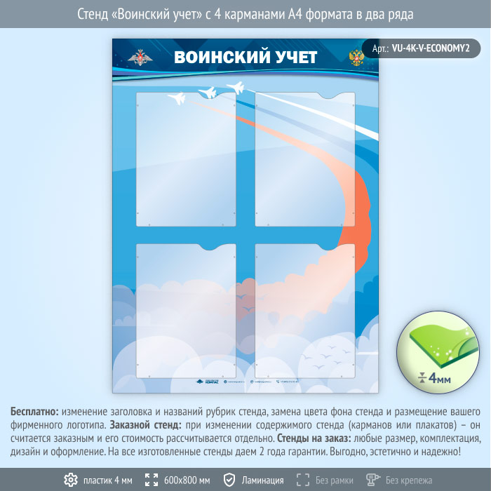 Стенд «Воинский учет» с 4 карманами А4 формата в два ряда (VU-4K-V-ECONOMY2) в Улан-Удэ купить