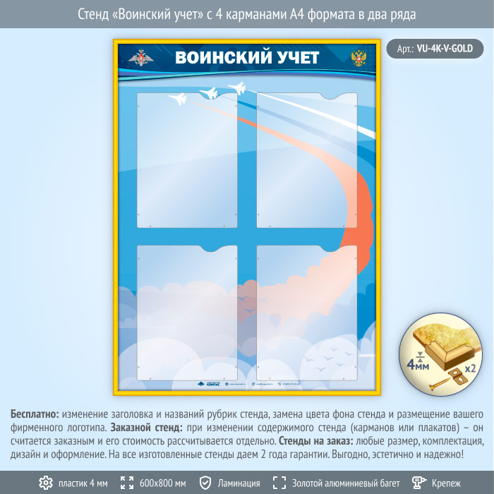 Стенд «Воинский учет» с 4 карманами А4 формата в два ряда (VU-4K-V-GOLD) в Улан-Удэ купить