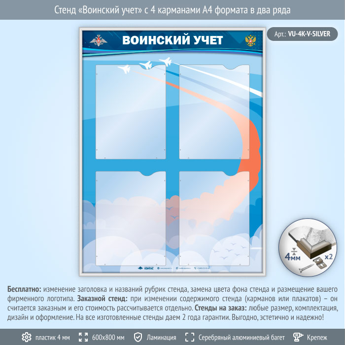 Стенд «Воинский учет» с 4 карманами А4 формата в два ряда (VU-4K-V-SILVER) в Улан-Удэ купить