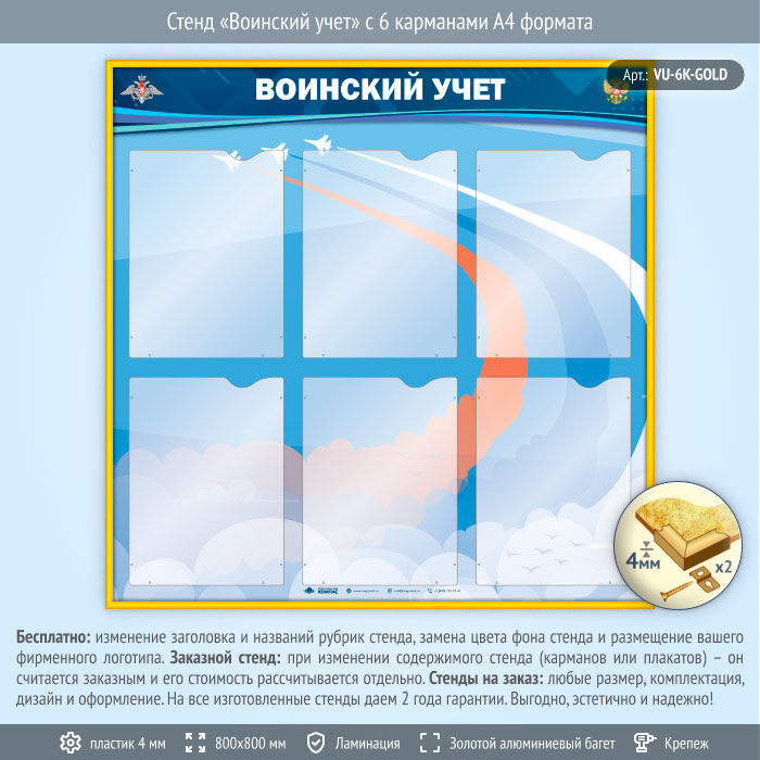 Стенд «Воинский учет» с 6 карманами А4 формата (VU-6K-GOLD) в Улан-Удэ купить