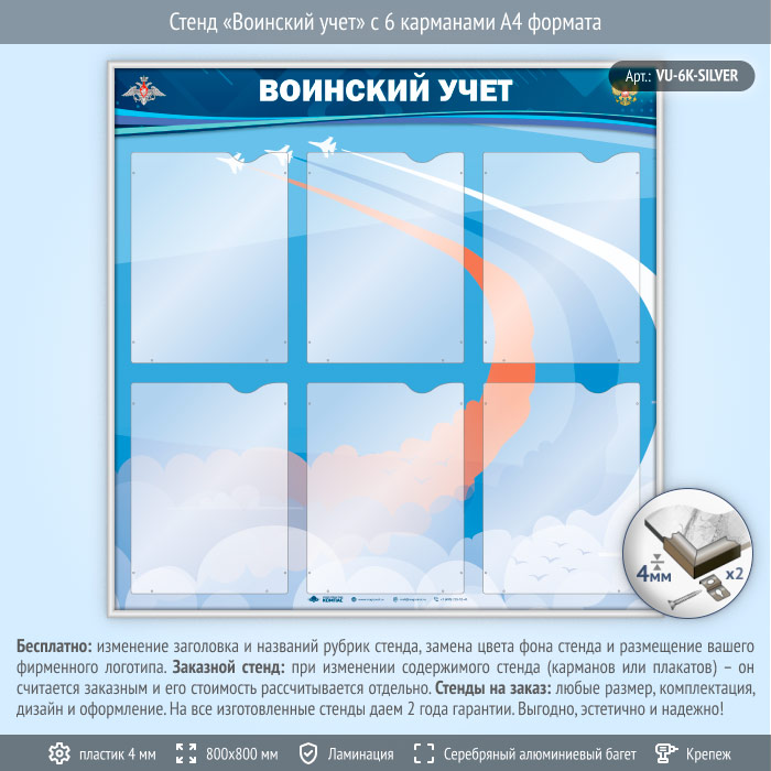 Стенд «Воинский учет» с 6 карманами А4 формата (VU-6K-SILVER) в Улан-Удэ купить