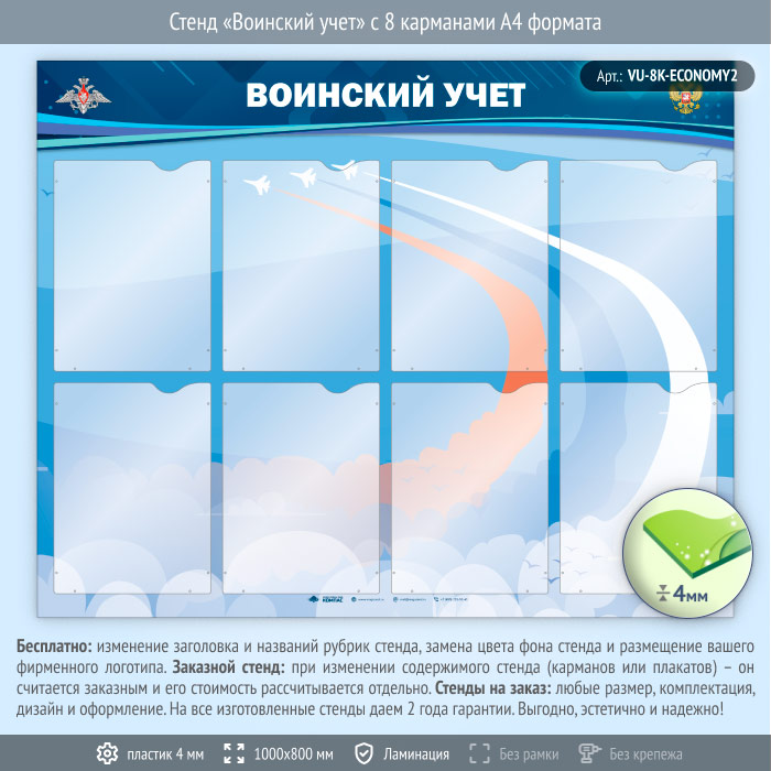 Стенд «Воинский учет» с 8 карманами А4 формата (VU-8K-ECONOMY2) в Улан-Удэ купить