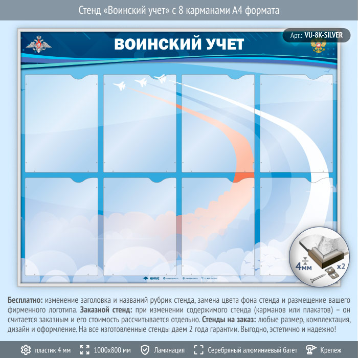 Стенд «Воинский учет» с 8 карманами А4 формата (VU-8K-SILVER) в Улан-Удэ купить