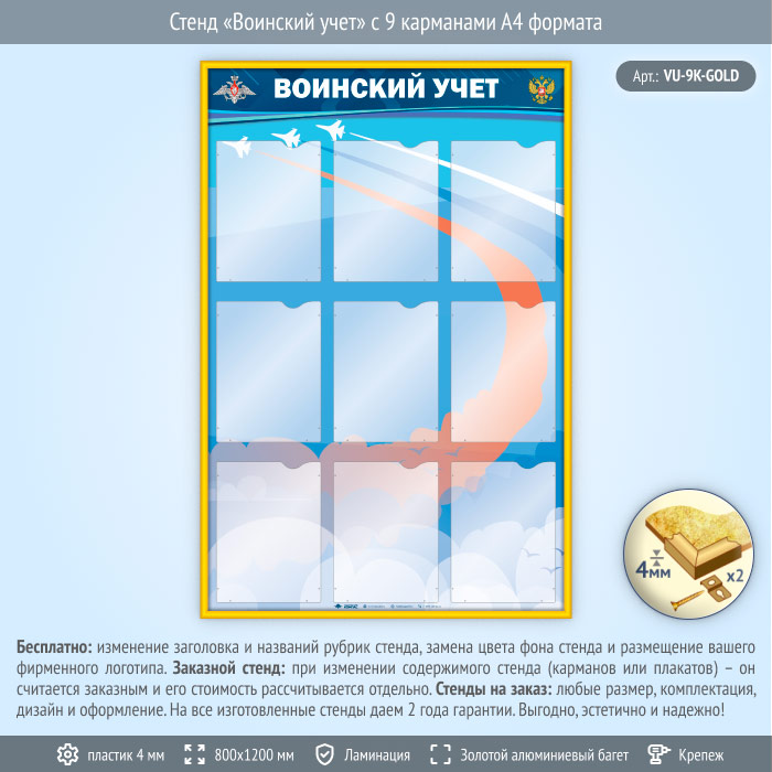 Стенд «Воинский учет» с 9 карманами А4 формата (VU-9K-GOLD) в Улан-Удэ купить