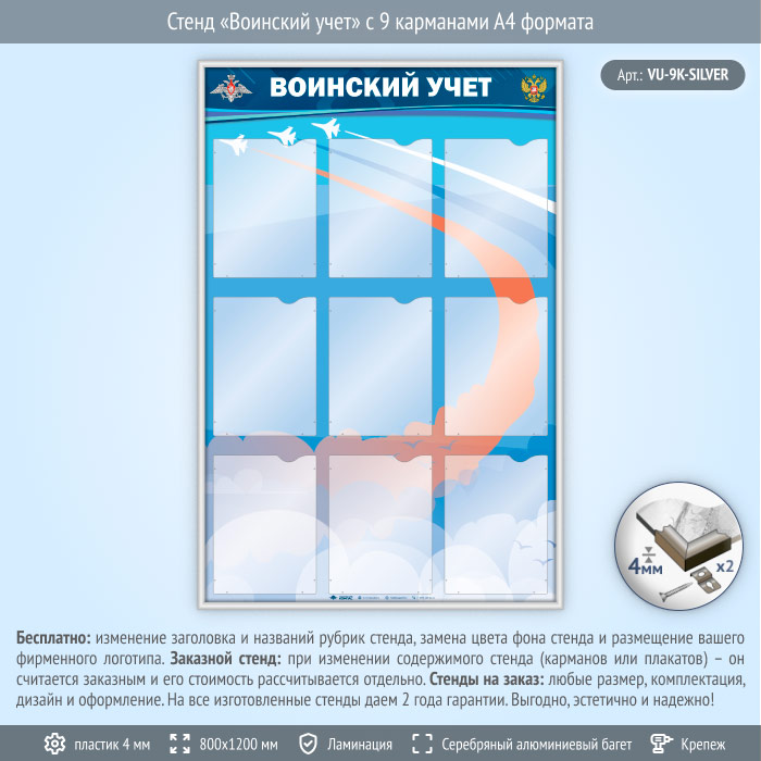 Стенд «Воинский учет» с 9 карманами А4 формата (VU-9K-SILVER) в Улан-Удэ купить