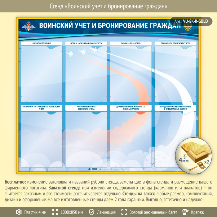 Стенд «Воинский учет и бронирование граждан» с 8 карманами А4 формата (VU-8K-R-GOLD) в Улан-Удэ купить