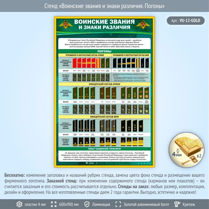 Стенд «Воинские звания и знаки различия. Погоны» (VU-12-GOLD) в Улан-Удэ купить