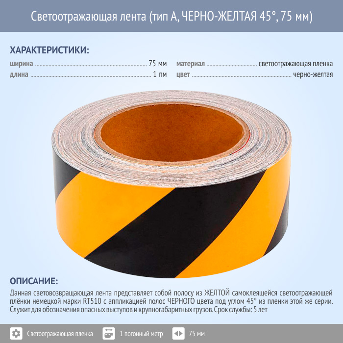 Светоотражающая сигнальная лента (тип А, ЧЕРНО-ЖЕЛТАЯ 45°, 75 мм х 1 п.м.) в Улан-Удэ купить