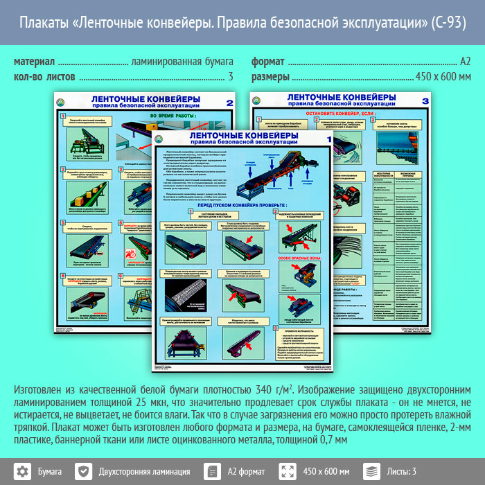 Плакаты «Ленточные конвейеры. Правила безопасной эксплуатации» (С-93, ламинированная бумага, А2, 3 листа) в Улан-Удэ купить