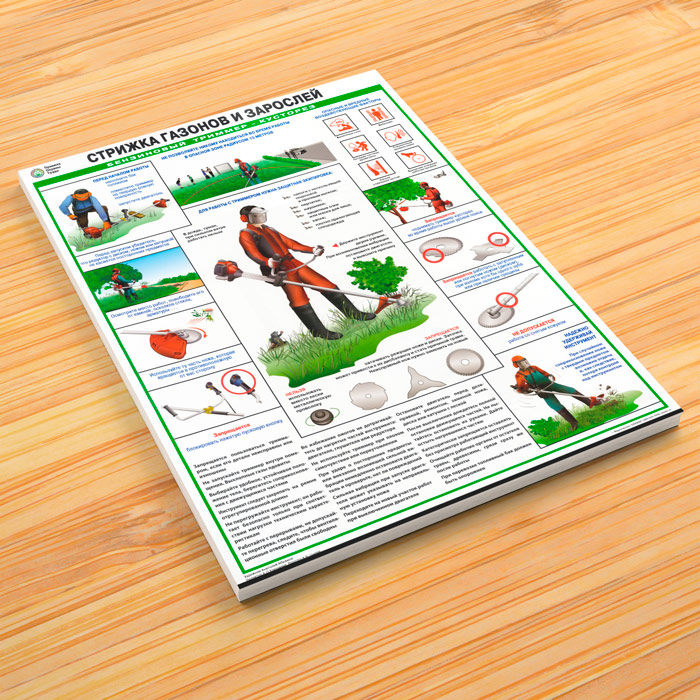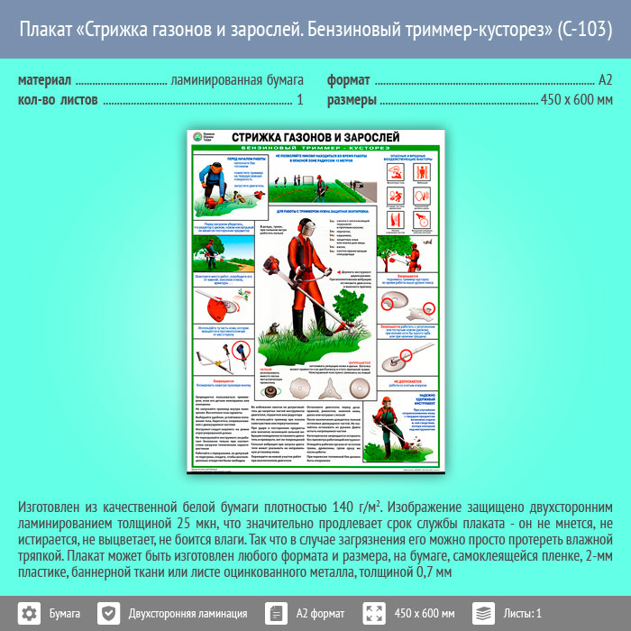 Плакат «Стрижка газонов и зарослей. Бензиновый триммер-кусторез» (С-103, ламинированная бумага, А2, 1 лист) в Улан-Удэ купить