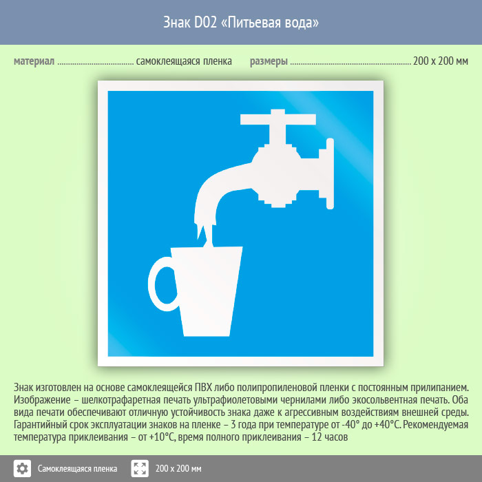 Знак D02 «Питьевая вода» (пленка, 200х200 мм) в Улан-Удэ купить