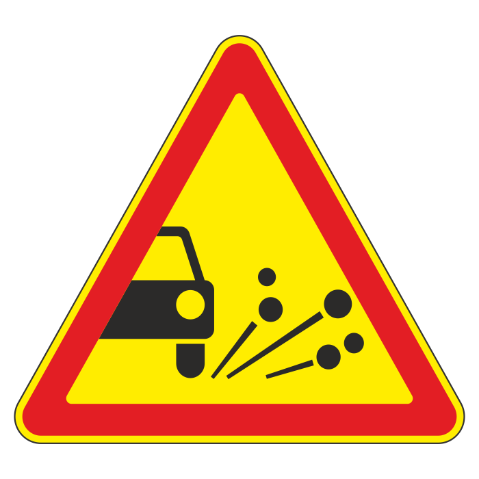 Дорожный знак 1.18 «Выброс гравия» (временный) (металл 0,8 мм, II типоразмер: сторона 900 мм, С/О пленка: тип А инженерная) в Улан-Удэ купить