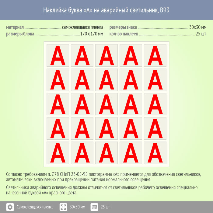 Наклейка буква «А» на аварийный светильник, B93 (пленка, 30х30 мм, блок 25 штук, 170х170 мм) в Улан-Удэ купить