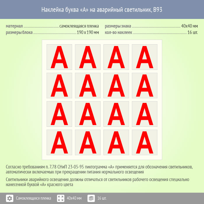 Наклейка буква «А» на аварийный светильник, B93 (пленка, 40х40 мм, блок 16 штук, 190х190 мм) в Улан-Удэ купить