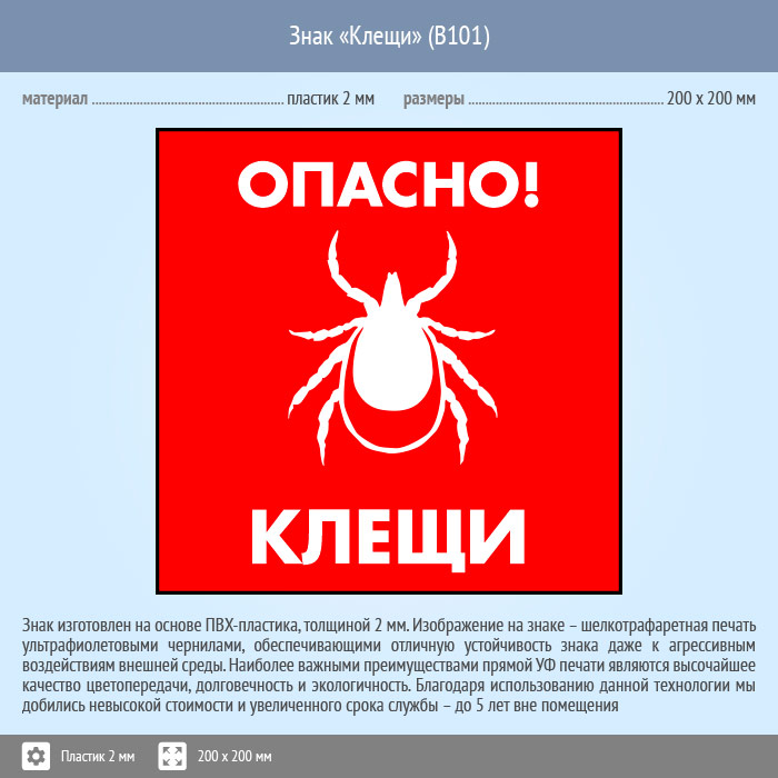 Знак «Опасно! Клещи», B101 (пластик, 200х200 мм) в Улан-Удэ купить