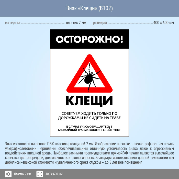 Знак «Осторожно! Клещи», B102 (пластик, 300х400 мм) в Улан-Удэ купить