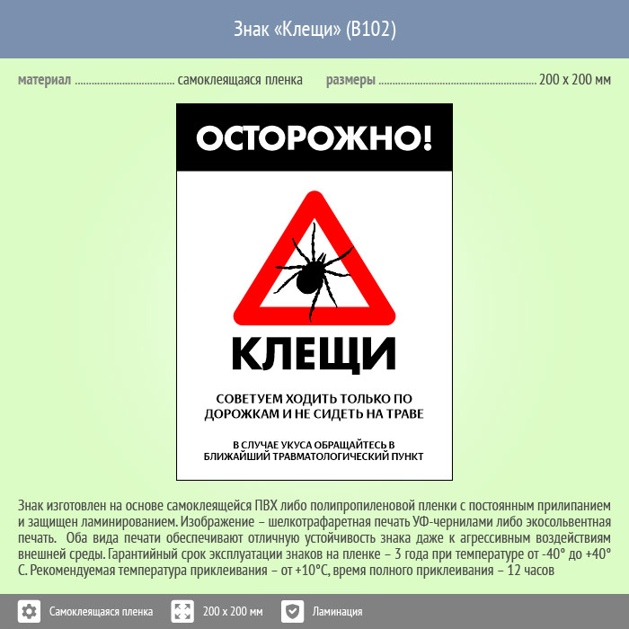 Знак «Осторожно! Клещи», B102 (пленка c ламинированием, 400х600 мм) в Улан-Удэ купить
