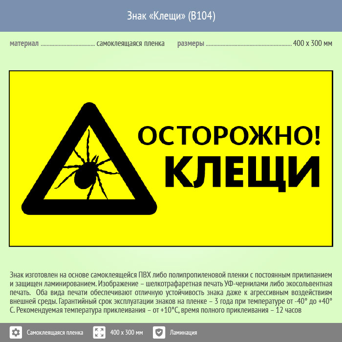 Знак «Осторожно! Клещи», B104 (пленка c ламинированием, 300х200 мм) в Улан-Удэ купить