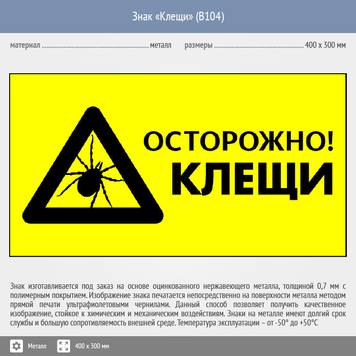 Знак «Осторожно! Клещи», B104 (металл, 300х200 мм) в Улан-Удэ купить