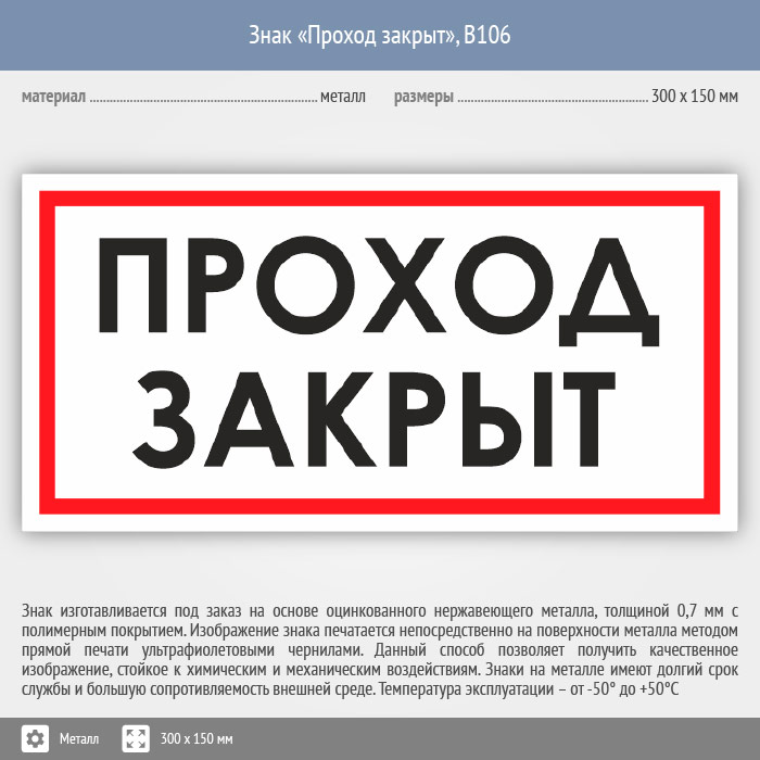Знак «Проход закрыт», B106 (металл, 300х150 мм) в Улан-Удэ купить