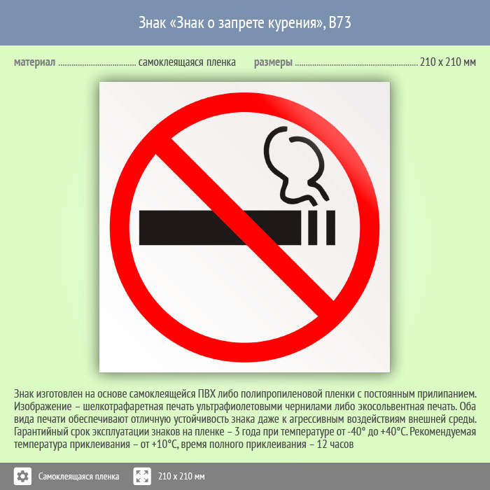 Знак «Знак о запрете курения», B73 (пленка, 210х210 мм) в Улан-Удэ купить