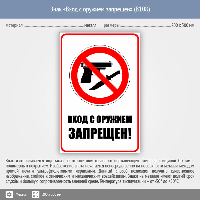 Знак «Вход с оружием запрещен», B108 (металл, 200х300 мм) в Улан-Удэ купить