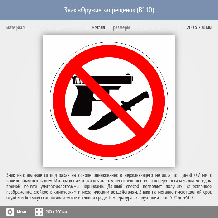 Знак «Оружие запрещено», B110 (металл, 200х200 мм) в Улан-Удэ купить