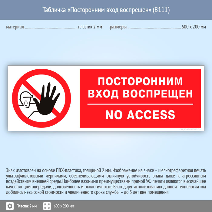 Табличка «Посторонним вход воспрещен», B111 (пластик, 600х200 мм) в Улан-Удэ купить