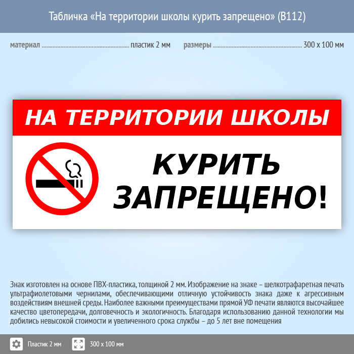 Табличка «На территории школы курить запрещено», B112 (пластик, 300х100 мм) в Улан-Удэ купить