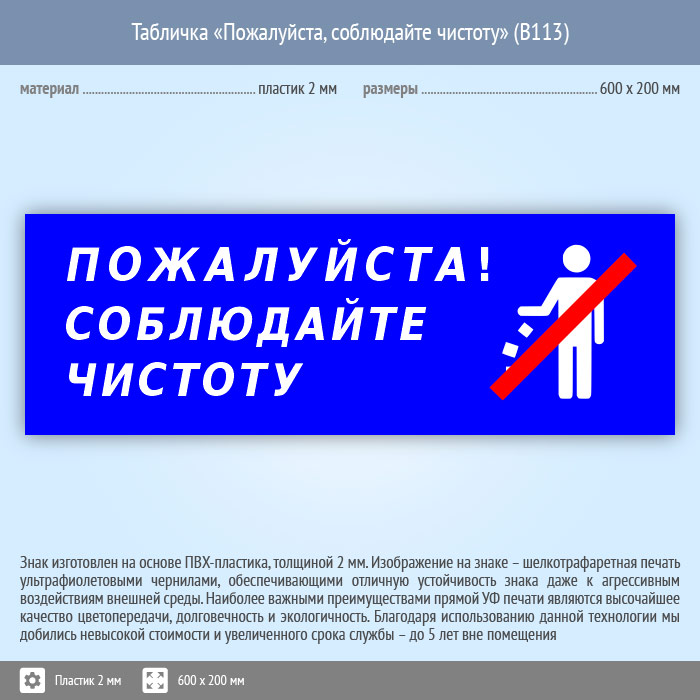 Табличка «Пожалуйста, соблюдайте чистоту», B113 (пластик, 600х200 мм) в Улан-Удэ купить