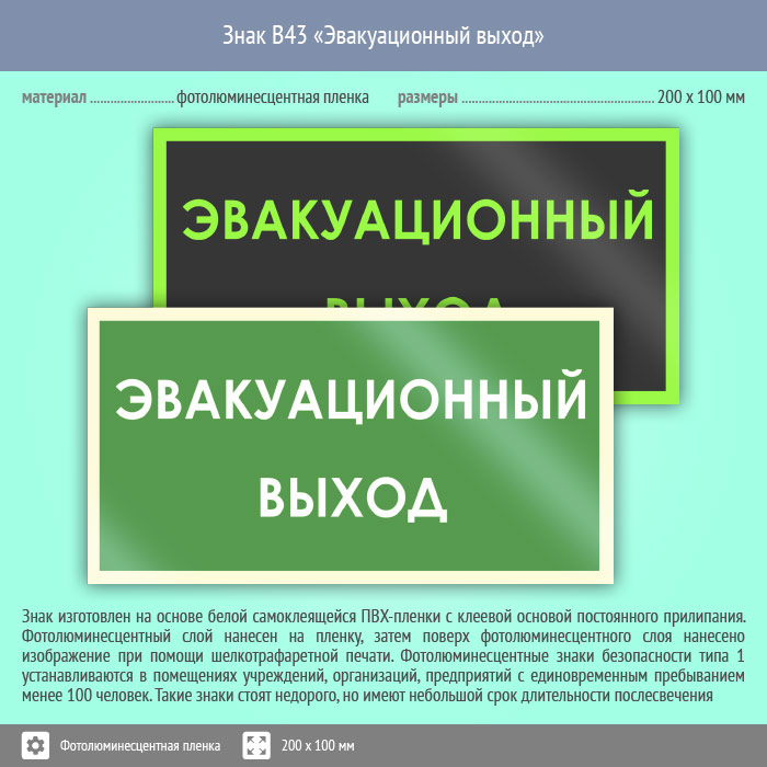 Знак B43 «Эвакуационный выход» (фотолюминесцентная пленка ГОСТ 34428-2018, 200х100 мм) в Улан-Удэ купить