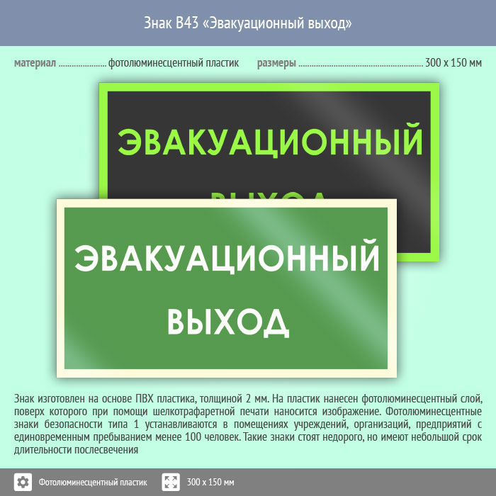 Знак B43 «Эвакуационный выход» (фотолюминесцентный пластик, 300х150 мм) в Улан-Удэ купить