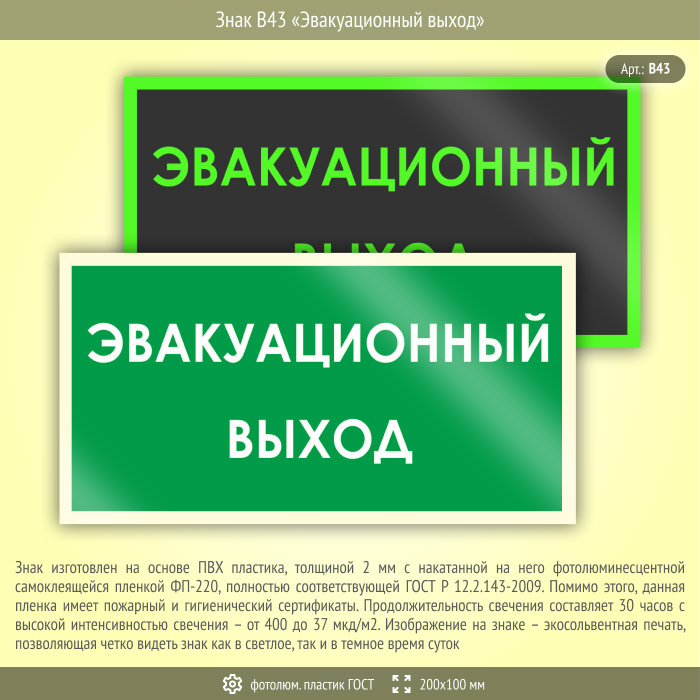 Знак B43 «Эвакуационный выход» (фотолюминесцентный пластик ГОСТ 34428-2018, 200х100 мм) в Улан-Удэ купить