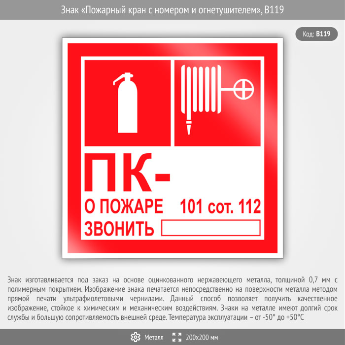 Знак «Пожарный кран с номером и огнетушителем», B119 (металл, 200х200 мм) в Улан-Удэ купить